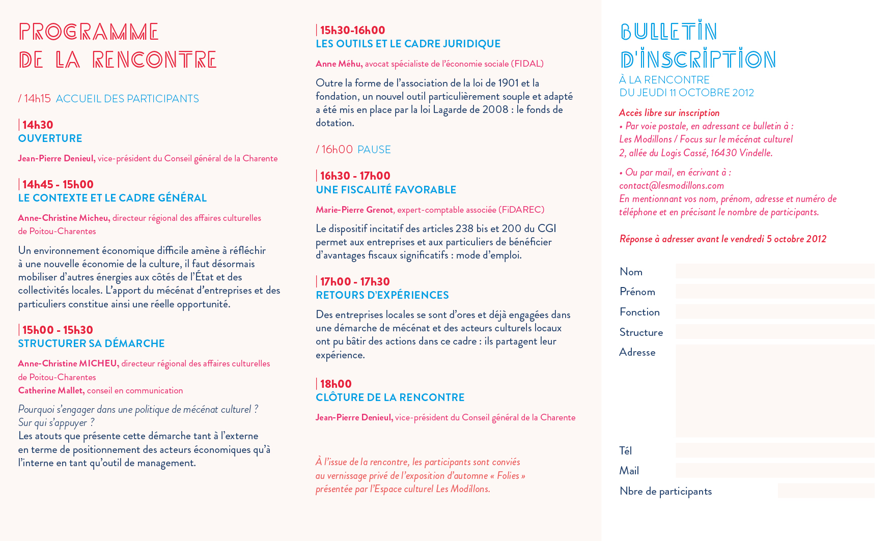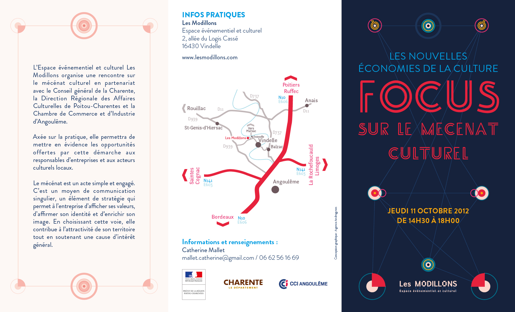 L’Espace événementiel et culturel Les Modillons a organisé une rencontre sur le mécénat culturel en partenariat avec le Conseil général de la Charente, la Direction Régionale des Affaires Culturelles de Poitou-Charentes et la Chambre de Commerce et d’Industrie d’Angoulême.